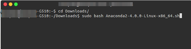 Ở trường hợp này file Anaconda2-4.0.0-Linux-x86_64.sh được lưu tại thư mục Downloads nên trước tiên phải trỏ tới thư mục Downloads bằng lệnh sau: